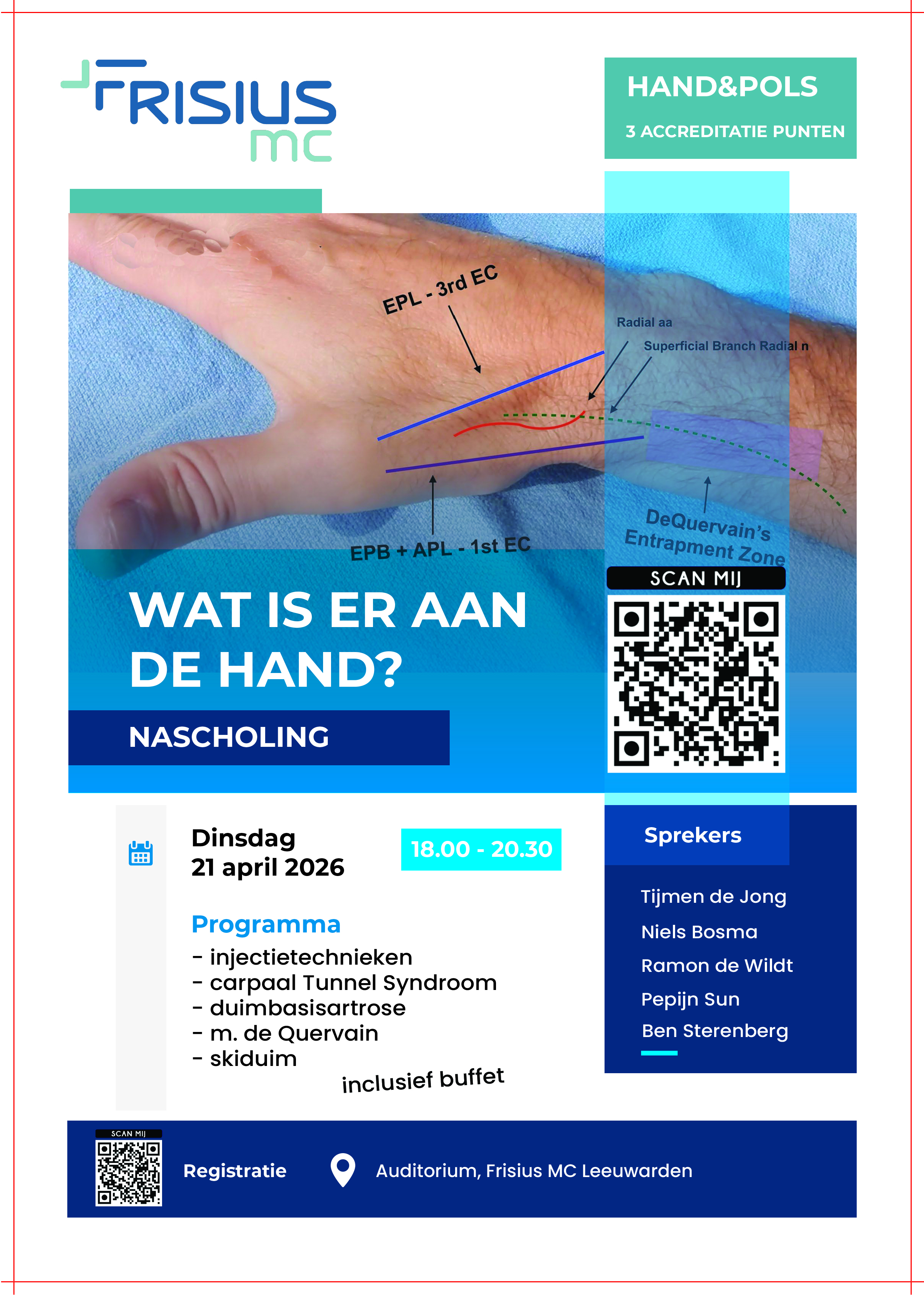 De presentatie wordt verzorgd door drs. Niels Bosma, Tijmen de Jong, Ramon de Wildt en Pepijn Sun, de handchirurgen van Friesland.